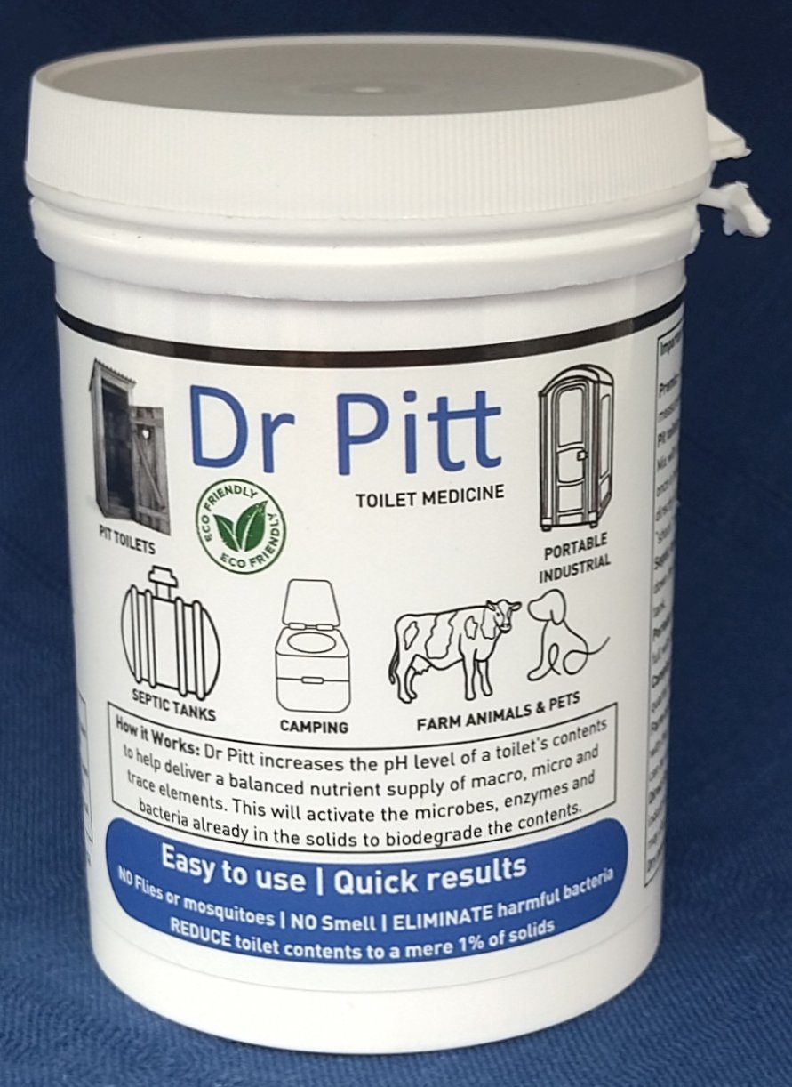 Multipurpose Pit Toilet, Septic Tank, Camping and Portable Industrial Toilet Sanitising Powder. With a single monthly dose of Dr Pitt, you will eliminate a toilets harmful bacteria together with the associated smell, flies and mosquitoes. FREE shipping for orders above R500!